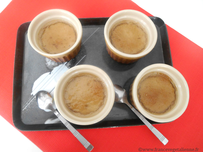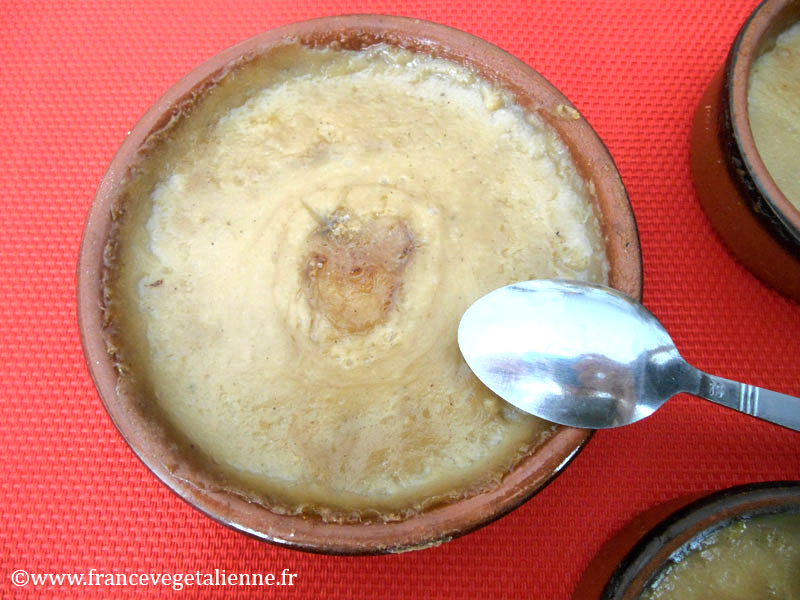 Dessert incontournable des restaurants et auberges du Roussillon, la crème catalane n’est autre qu’une version légère de la crème brûlée, parfumée aux agrumes. Faite de lait (nous avons utilisé du lait de soja), d’œufs (que nous avons remplacés par du tofu soyeux), de sucre et d’arômes divers, elle est servie dans une petite cassolette en terre cuite vernissée.