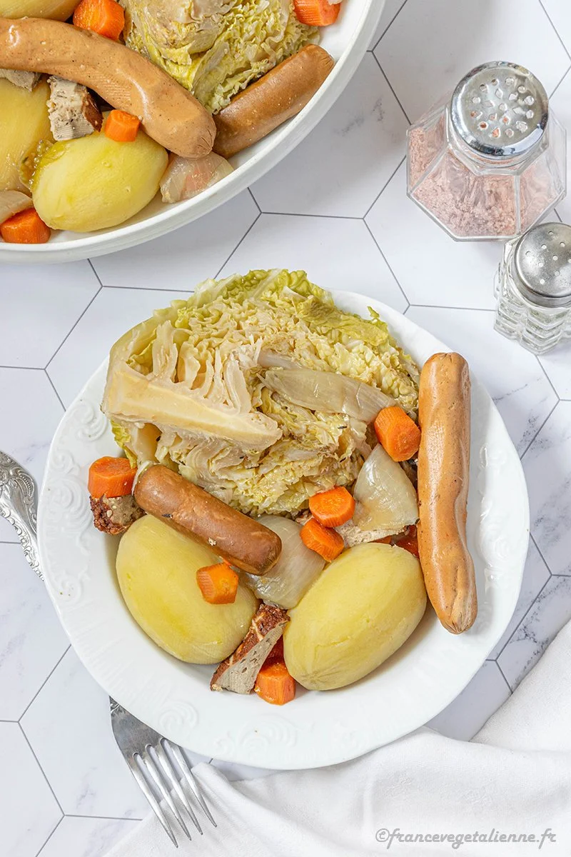 Éplucher et laver les légumes. Laver et couper le chou en quatre. Le faire cuir 15 minutes dans l’eau bouillante salée avec l’oignon coupé en gros quartiers, les carottes en rondelles épaisses et les pommes de terre entières épluchées. Prélever 50 cl du bouillon de cuisson, puis égoutter les légumes. Placer les légumes dans une cocotte avec le bouquet garni caché au milieu. Mouiller avec le bouillon et amener à ébullition. Couvrir et laisser mijoter 45 minutes à feu doux. Rajouter les lardons (coupés assez gros) de tofu fumé et joindre les saucisses (faire glisser les simili carne sous les morceaux du chou pour qu’ils baignent dans le bouillon). Laisser cuire 15 minutes supplémentaires. Disposer joliment dans un plat le contenu de la cocotte et servir aussitôt.