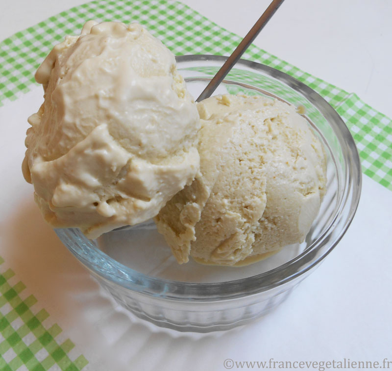 Elle se végétalise parfaitement bien avec des noix de cajou (broyées en une crème fine avec de l'eau) et le lait de coco (dont on prend la partie solide). Le tout, sucré, additionné d'un peu d'huile et, bien sûr, d'extrait de vanille, est mixé, coulé dans un bac et placé au congélateur.