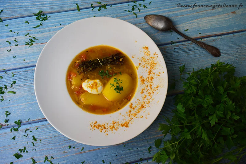 Cette bouillabaisse étant végétarienne, son adaptation en version végétale ne devait pas poser de problème. Seul écueil: les œufs pochés, lesquels donnent son identité au plat! Que faire? Pour s'éviter la réalisation d'un simili-œuf, mieux vaut contourner la difficulté par un rond de crème végétale épaisse ou de yaourt de soja, versé dans l'assiette au moment du service.