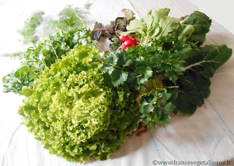 1,5 kg d’un assortiment «d’herbes» (nous avons utilisé: les feuilles de 3 betteraves rouges, les fanes d’1 botte de radis, le vert de 6 blettes, les feuilles de 2 céleris rave, les «jets» ou pluches de 4 fenouils, les feuilles d’1 bouquet de persil, 1 salade verte)