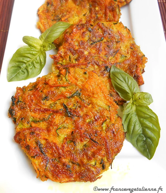 Eplucher les carottes, laver la courgette et les râper (grille moyenne). Eplucher les échalotes et les émincer. Mélanger les légumes, afin que le contenu du saladier soit bien bariolé. Continuer de mélanger avec la crème végétale, le curcuma, la fécule de maïs ou la farine, le poivre, le sel, les herbes hachées. Former des galettes, directement dans la poêle huilée (qui n'accroche pas!), ou bien en tassant dans un ramequin que l'on retourne dans la poêle. Cuire à feu moyen-doux à peu près 10 minutes (il ne faut pas que ça grille) en déplaçant légèrement les galettes pour ne pas qu'elles accrochent. Les retourner sur l'autre face et laisser cuire 5 à 6 minutes.