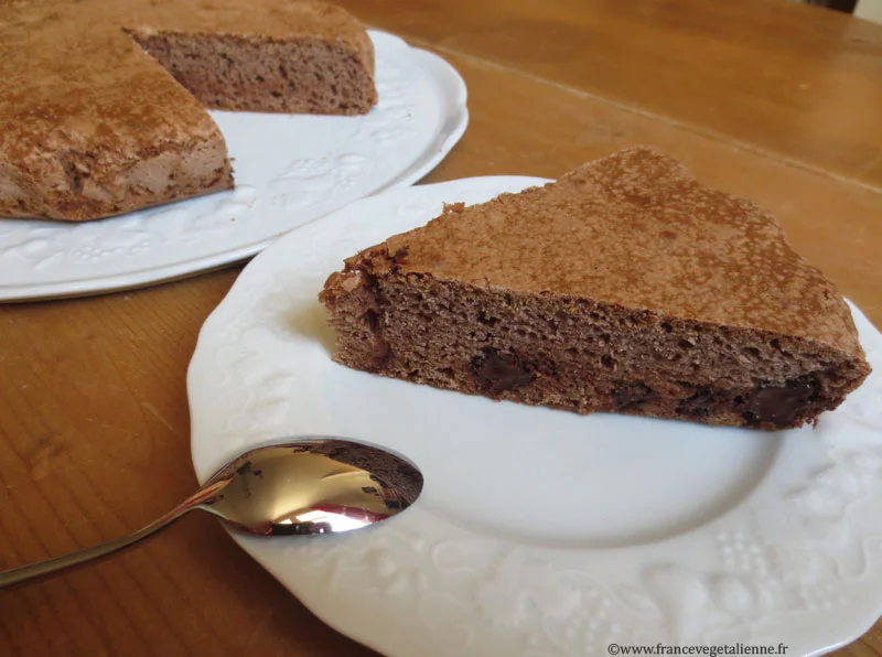 Fouettez les deux yaourts de soja avec le sucre dans un saladier. Ajoutez progressivement l’huile tout en continuant de mélanger. Ajoutez ensuite le reste des ingrédients secs : farine, levure et bicarbonate. Mélanger jusqu’à obtenir un mélange homogène, et ajoutez progressivement le lait de soja jusqu’à obtenir une texture plus souple. Découpez en pépites tout le chocolat, de la grosseur que vous voulez. Incorporez ces pépites dans l’appareil, puis versez celui-ci dans un moule huilé et fariné ou tapissé de papier cuisson. Enfournez dans un four préalablement chauffé à 200°C, laissez cuire 35 à 45 minutes. Vérifiez la cuisson avec la pointe d’un couteau.