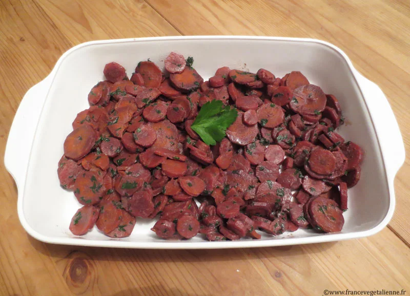Pour changer un peu, pourquoi ne pas utiliser des carottes colorées? Il en existe une multitude de variétés. Dans cette recette, j’ai utilisé les carottes à ma disposition, soit un mélange de carottes oranges et de carottes violettes (vous pouvez trouver la version classique des carottes Vichy ICI).