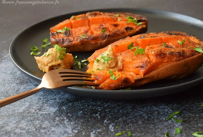 Cette recette est tellement simple et délicieuse que pour moi c'est devenu la seule bonne façon de cuisiner les patates douces! La chair fondante et légèrement grillée de la patate douce, parfumée d’épices, qui se marie parfaitement avec la sauce à l’houmous bien relevée… hummm!